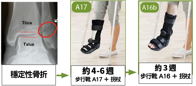 若患者不願接受石膏固定,可選擇使用高身步行靴(A17)固定約3星期,期間需進行X光檢查,以確保骨折沒有移位。同時應使用枴杖,避免受傷足踝負重,以防止骨折移位。