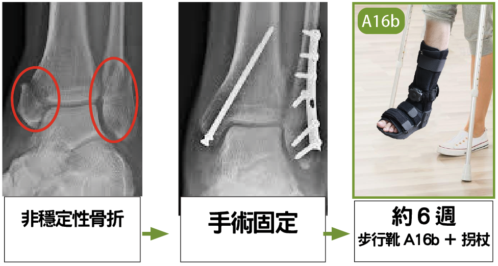 術後還需進行X 光檢查,以確保復位效果良好。術後6 週,應使用短身步行靴(A16b),同時使用拐杖,從而保護手術傷口和固定足踝,並減輕負重或擺動引起的疼痛,此期間可用拐杖作漸進式負重復康比較安全。