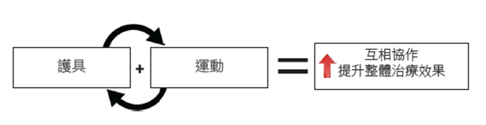 護具和運動之間存在高度相輔相成作用,它們擁有協同作用產生相得益彰帶來更好的治療或復康效果,尤其是在創傷後癒合和術後康復,及慢性脊椎和關節疾病的治療。護具能「提供支撐」、「限位固定」、「矯形緩痛」及「解決神經受壓的痛楚」等問題,而運動則能增強肌肉力量和關節活動功能。結合適合的護具和適當的運動訓練,可以改善體感平衡和整體康復效果,並可糾正脊椎和關節錯位之彎曲問題。