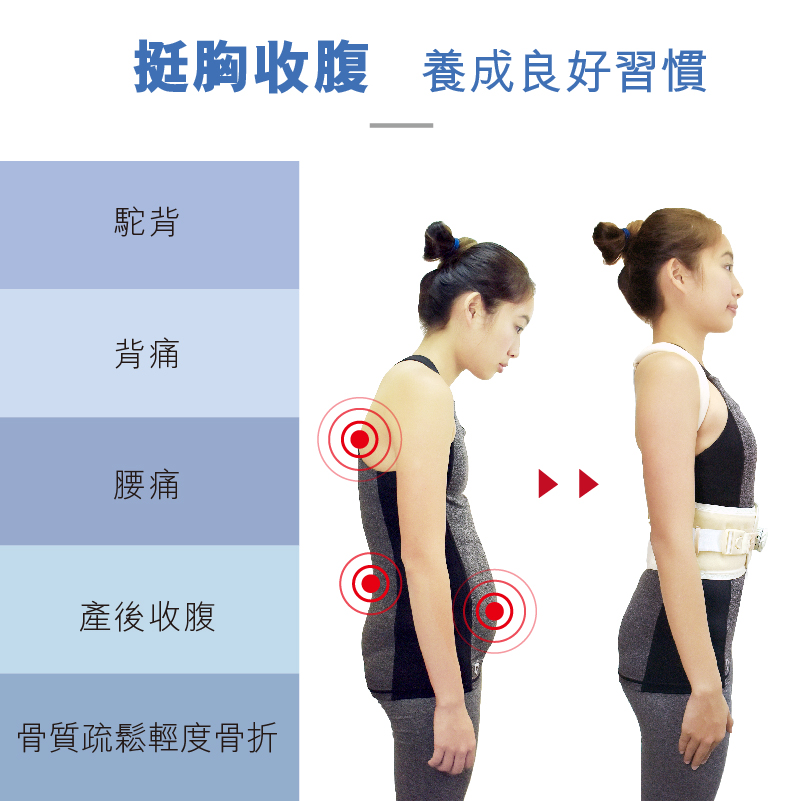 - 防止駝背、糾正壞姿、挺胸美姿、減少腰背痛